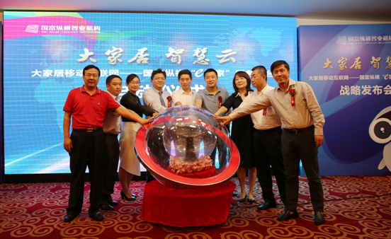 (中國(guó)家具協(xié)會(huì)理事長(zhǎng)朱長(zhǎng)嶺、國(guó)富縱橫董事長(zhǎng)趙龍博士等嘉賓開啟“e管家”發(fā)布儀式)