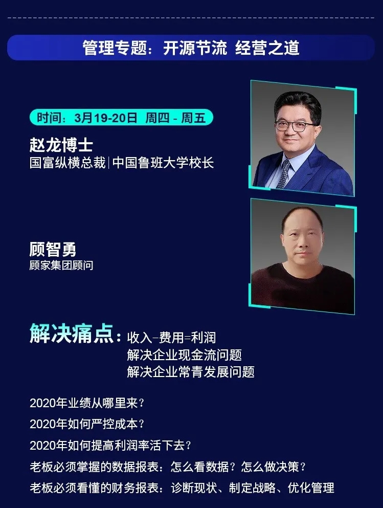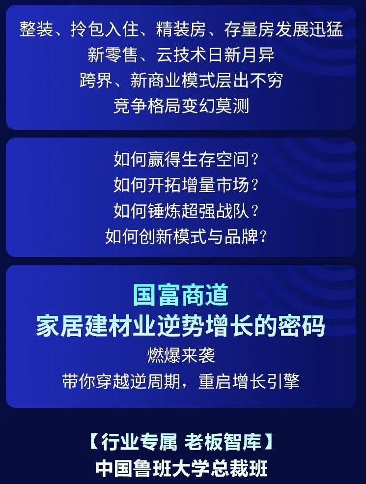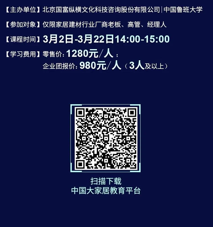 為了幫助家居企業在2020年逆勢突圍,中國魯班大學&國富縱橫重磅推出年度大課——《國富商道》,這是一堂2020家居建材老板必上的增長課,專門針對經銷商老板、中高管和生產企業老板、中高管的專屬課程。自3月2日起至3月22日,中國魯班大學&國富縱橫將通過21天的直播大課為您帶來大變局中的增長戰略,品牌逆勢的運營之道、營銷模式的突破之道、組織強大的鐵軍之道、用戶裂變的增長之道、精細管理的經營之道,一切精彩盡在中國大家居教育平臺,敬請期待!